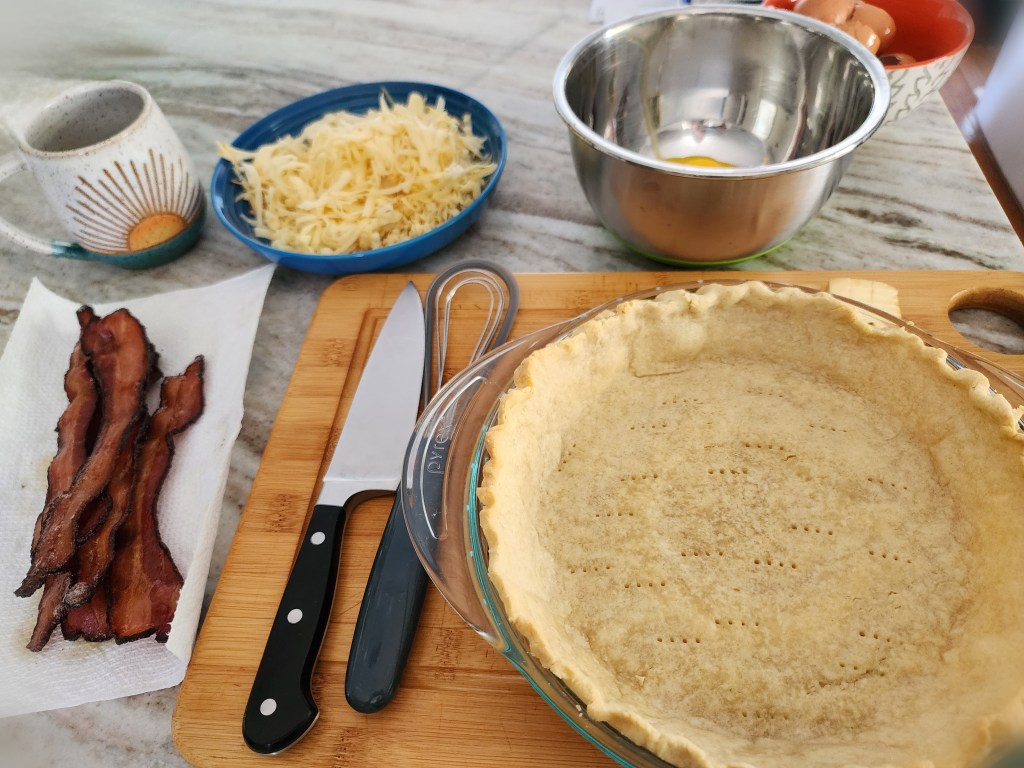 - Evenly sprinkle the carmelized onions and bacon on the cooked pie crust. Then add cheese. Pour the egg and cream mixture over everything.